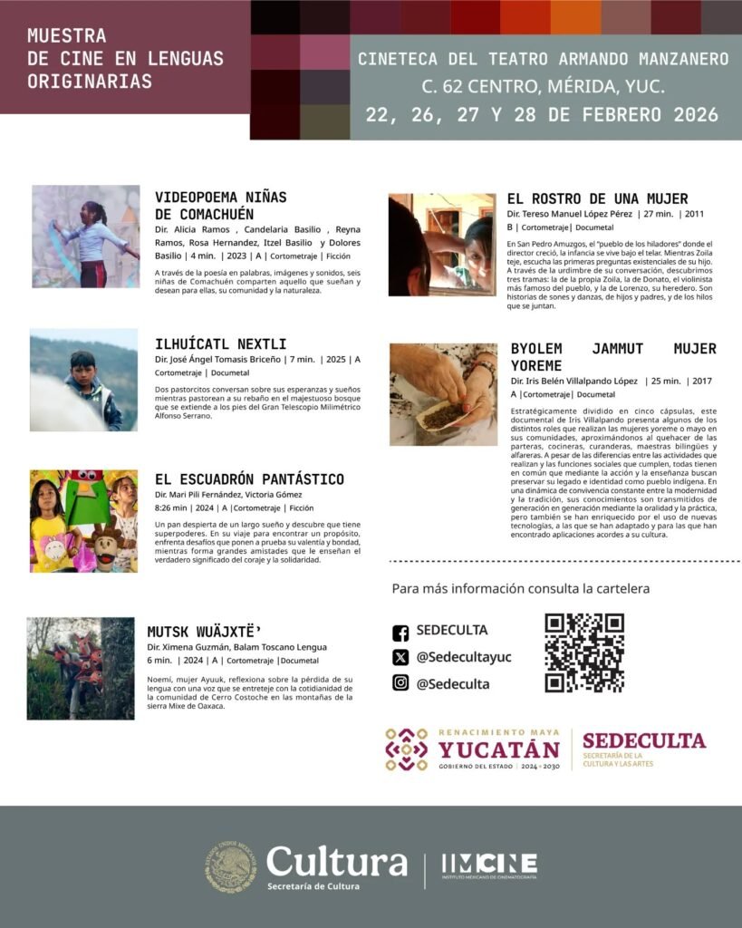 La Cineteca del Teatro Armando Manzanero, de la Sedeculta, abre sus puertas a la Muestra de Cine en Lenguas Originarias: historias contadas desde el territorio, la identidad y la resistencia de los pueblos originarios de México.